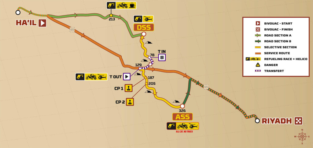 De dag begint zeer vroeg in Ha’il. De motoren vertrekken als eerste uit het bivak om 04.00 uur, gevolgd door de auto’s en trucks vanaf 06.10 uur. Na de lange verbindingsroute start de etappe voor de motoren om 08.30 uur. De FIA categorieën beginnen hun proef later, met de eerste start om 10.40 uur. Het tijdschema is ruim opgezet, maar de lengte van de dag vraagt veel van mens en machine.