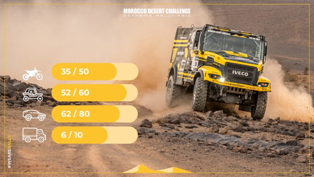 De belangstelling voor de Morocco Desert Challenge blijft groeien. Momenteel staan al 155 voertuigen ingeschreven. In de autoklasse gaat het om 62 deelnemers. Daaronder bevinden zich meerdere Overdrive Toyota’s, Red Lined voertuigen, Century prototypes en MD buggies. Daarnaast staan ook klassieke rally-iconen aan de start, zoals de Toyota HDJ80, Mercedes G en Mitsubishi Pajero EVO. Opvallend is dat bijna de helft van de ingeschreven auto’s uitkomt in de T1+ categorie, wat wijst op een hoog niveau en genoeg verwachtingen.