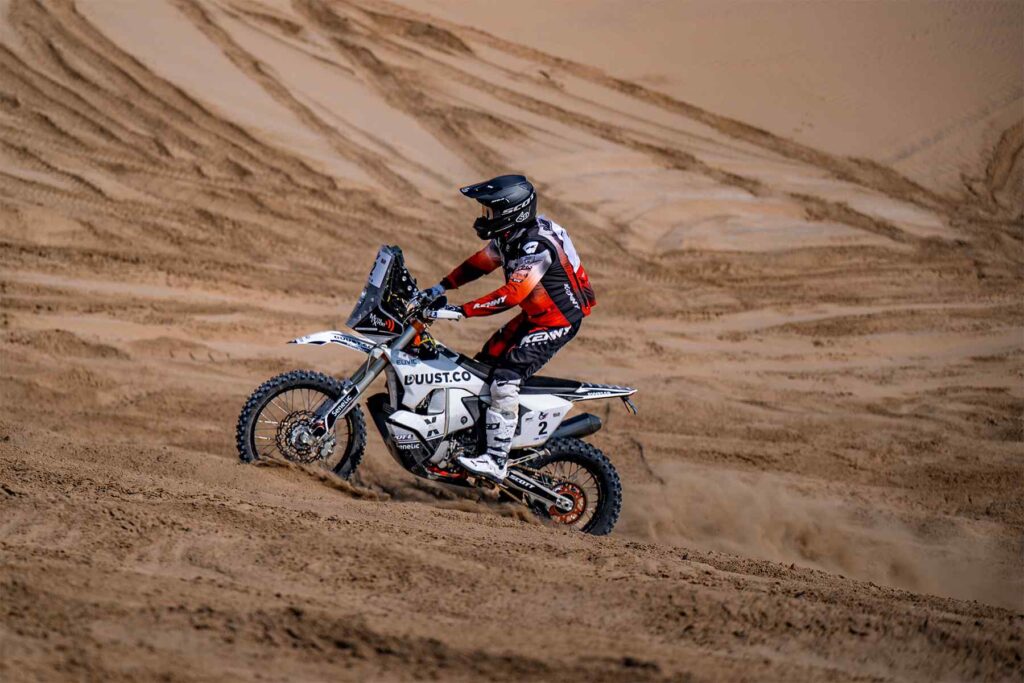 Dutch rider Luc Dumore saw his rally end on a sour note. He lost more than an hour due to mechanical trouble but managed to get his Husqvarna to the finish. He placed 30th on the second stage and ended 32nd overall among the bikes — a respectable result in such a competitive field.