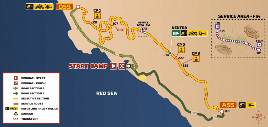 The stage starts and finishes in Yanbu and covers a total distance of 524 kilometers. Of this, 305 kilometers are against the clock. The liaison sections are also significant, with 100 kilometers before and 119 kilometers after the special. For the competitors, this marks the first true endurance day, where stamina and focus play a crucial role.